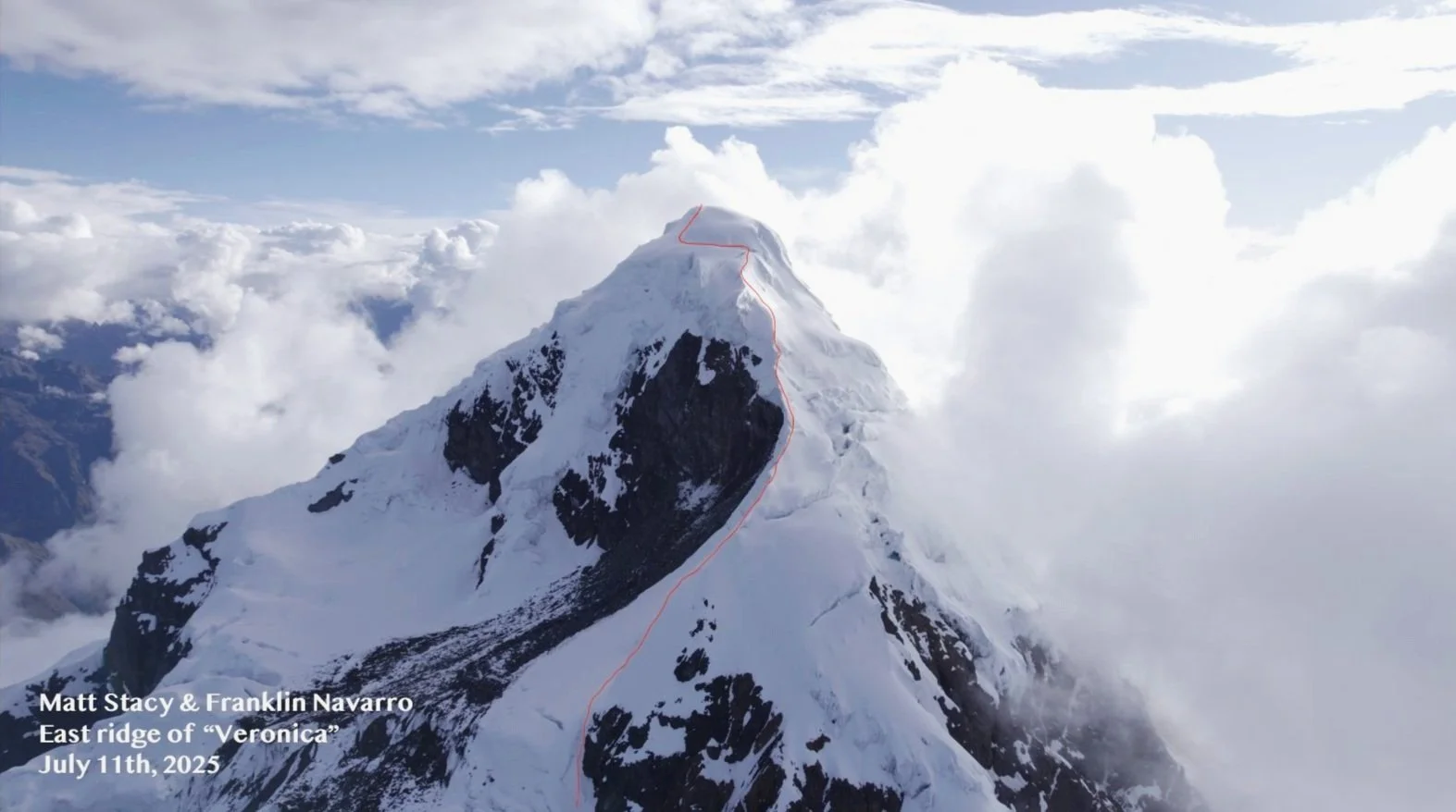 Sunrise began at 5am as we approached the start of the final winding section of the NE ridge. I must admit that adventuring in the high alpine at sunrise is one of my favorite feelings. And I live for it. There's something about starting a new day by moving my body, testing my courage and abilities, and being in pure oneness with the natural environment around me that I cannot live without. Being on that ridge as the sun gave birth to the morning was an ethereal experience. It dropped away with more than 500 meters of exposure on both sides, revealing the Sacred Valley to the south and the vast Amazon below to the north. We weaved our way up the ridge for a few hours until reaching the final summit slopes, which consisted of easy crevasse navigation and walking through punchy windboard snow for an additional 50 meters of elevation. At last, after an 8.5-hour push from high camp, Franklin and I stood on Nevado Veronica’s summit at 9:30 a.m. on July 11, 2025.
